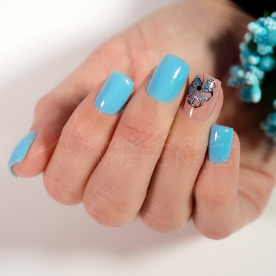 F. Apply a thin layer of your chosen, well pigmented Mystic Nails gel polish colour, then cure in UV (2min) or LED (1 min) light