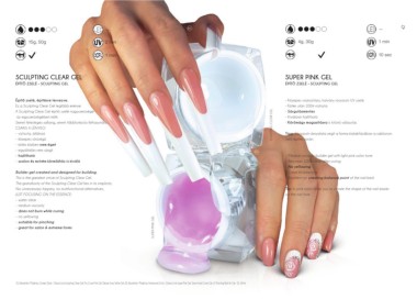 01. Készítette / Made by: Gyimesi Dóra - Classic Line Sculpting Clear Gel, Pro Cover Pink Gel, Deluxe Snow White Gel, 02. Készítette / Made by: Horesnyiné Gitta - Classic Line Super Pink Gel, Stone Hard Cover Gel, UV Painting Nail Art Gel - 01. White