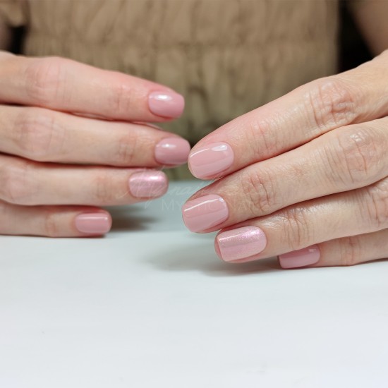 2, Apply the Shimmer Pigment Dust (08) with the natural haired brush on the tacky residue of the Polish-Gel. Remove the surplus of the pigment which does not stick in the gel with the same brush.